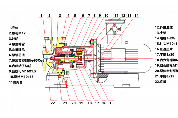 IMC-type magnetic drive pump (referred to as magnetic pump) is a new product that applies the working principle of permanent magnet coupling to a centrifugal pump. It has reasonable design, advanced technology, full seal, no leakage, corrosion resistance, and other characteristics, and its performance has reached the advanced level of similar foreign products. Stainless steel magnetic pump with a static seal instead of a dynamic seal, so that the flow parts of the pump in a completely sealed state, completely solving the other pump mechanical seal can not avoid running, bubbling, or dripping ills. The magnetic pump uses corrosion-resistant, high-strength stainless steel as a manufacturing material, so it has good corrosion resistance and can make the transported medium free from pollution. Design pressure: 1.6MPa Flange Standard: HG/T20592-09.
